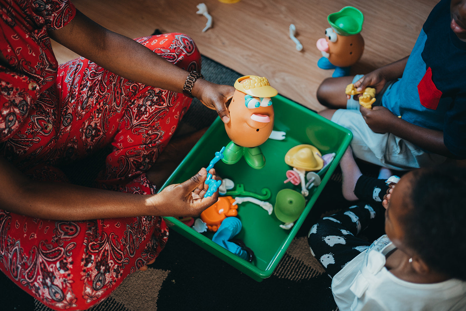 As toddlers pick up, twist, and place the potato parts (eyes, ears, arms, etc.), they’re strengthening hand-eye coordination and developing dexterity. By naming each part (nose, ears, mouth), toddlers are supported in language development, spatial understanding and self-awareness.